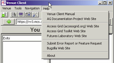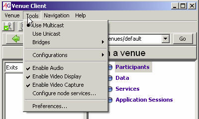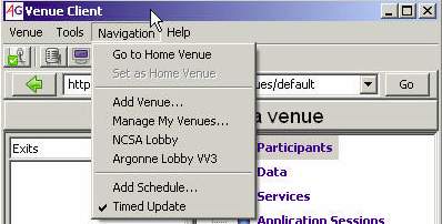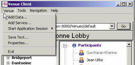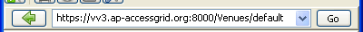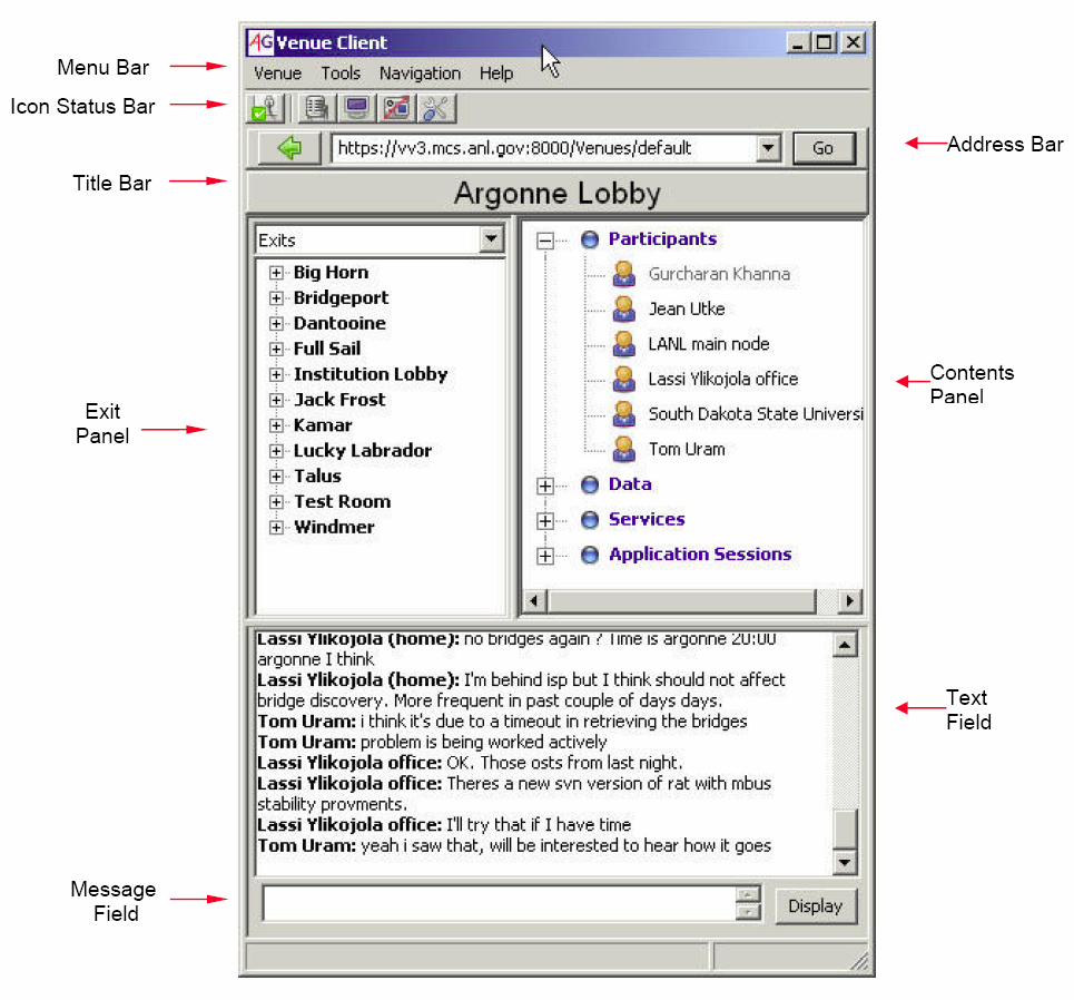 The Venue Client is used to connect and participate in an Access Grid Virtual Venue. It displays the contents of the Virtual Venue, connections to other venues and an interface to configure your node arrangement. The description below explains the different components that represent the Venue Client. The Menu Bar contains the menu items that are used to control and configure the Venue Client. Clicking on an item in the Menu Bar will display a drop down menu for each topic. Selecting Venue from the Menu Bar will display a drop down menu. From this menu, you can add data to the Data Section, add service, start a Shared Application Session, save text from the Text window, manage the properties of your venue client or exit the venue client. Selecting Tools from the Menu Bar will display a drop down menu with options that will allow you to configure your node,select either multicast or unicast connection, select a unicast bridge or change your Venue Client preferences. Navigation displays a drop down menu with selections allowing you to bookmark your venues, adding shortcuts to the navigation process. You may also add a schedule to via this menu or manage a timed update. Help displays links to the Venue Client documentation, Access Grid websites, the website to report software problems and information about the Venue Client version. Address Bar is used to connect to a venue. You are allowed to enter two different types of addresses in the address bar, either the default venue on a venue server or a actual address of a specific venue. You can see the Venue Client connected to default venue on a venue server running on host "vv3.ap-accessgrid.org" using port 8000. After writing the address in the address bar, click the "Go" button to connect to the venue. The Status Icon section displays icons representing frequently used shortcuts used to configure your Venue Client. |