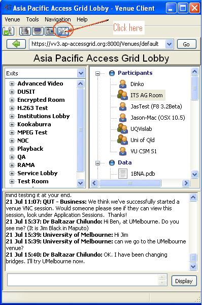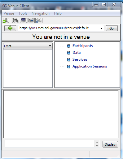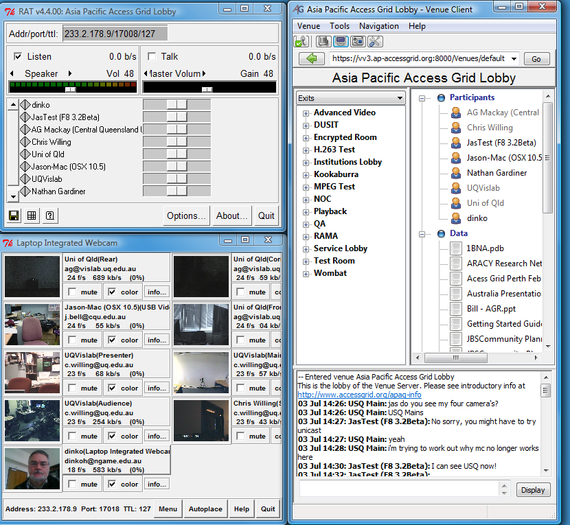 Access Grid as an open source software is free and can be used on Windows, Linux and Apple computers.The Access Grid is an Internet-based model for video conferencing that focuses on group-to-group communication, large scale distributed meetings, collaborative work sessions, seminars, lectures, tutorials and training. It also provides an access point for individual desktop users, permitting one-to-many or one-to-one communication. Access Grid allows for audio and video exchange as well as the sharing and interacting with files and applications. It provides an environment for cooperative work between remote participants through the application of open-source software and Internet technology. The virtual meeting space, where people come together to collaborate in the Access Grid, is called a Virtual Venue. Users connect to a Virtual Venue from their particular environment, identified as a node,which contains collaborative resources need to provide high-quality user experience. Access Grid users are given the ability to configure nodes according to their own preference. Example of node configurations are a desktop using a webcam or entire room with several microphones, cameras and advanced display environments. AccessGrid 3.2AG 3.2 is the newest version of the Access Grid software. Many of the underlying technologies have been updated or re-engineered to conform to standard Internet technologies and protocols, to maximize robustness, performance, and interoperability. All network connections are encrypted by default. To download software go to: http://www.accessgrid.org/software and on the right hand side chose Access Grid bundle After downloading software run (As Administrator) AG Venue Client and you will be presented with the default: To go to the Asia Pacific Access Grid Venue In the Venue Address box type in "https://vv3.ap-accessgrid.org:8000/Venues/default" and click on Go button. That will open Asia Pacific Access Grid Lobby with the list of all participants. For the list of all Venues go to To configure your Video and Audio you have to click on setting icon, Select Service and Add..., select VideoService, click OK, select your camera and click OK. Do the same for the Audio. You can now remove all other Services (except AudioService and VideoService) and Store Configuration as a Standard. NOTE: Even if you are the only user on your computer and you are the administrator you have to right click on file and chose "Run as an Administrator", not as you for all installations. Description of Venue Client |