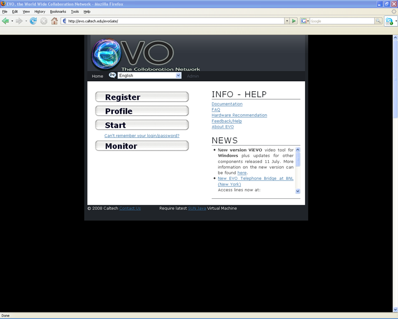 communication and some extra functions. It is able to be used with a minimum of software installation (only Java required), a minimum of support and runs on Mac, Linux, and Windows and minimum hardware 1-1.5 GHz processor, 512MB RAM preferred 1GB, any working camera (not all webcams work with all versions of all operating systems) and working audio (to hear and talk to others but with no audio feedback loop). To use EVO you have to register at http://evo.caltech.edu (it's free). Once you start EVO you can search for communities