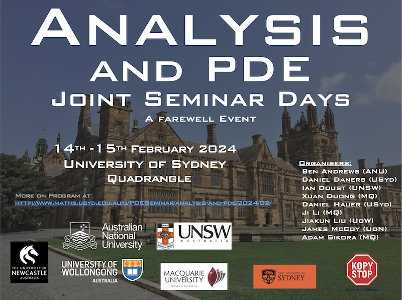 The seminar is associated with the Non-Linear Analysis Research Group. Organisers: Jiakun Liu (web master Daniel Daners).