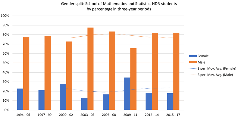 The table below shows the numbers of male and female students who completed higher degrees (research) in the School between 1994 and 2017.