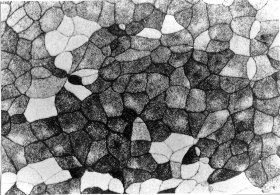 This is a small part of the pigment epithelium in the chick eye. Photo taken by Valerie Morris, who has kindly provided it for this page. During development, these cells (which are in a 2-d sheet) grow and then divide, with a division plane roughly orthogonal to the plane of this picture. These planes are seen as lines in the picture. When first formed, the division "line" forms two T-junctions at either end (as can be seen for a recently divided cell in the top left corner of the photo.) Later, the line contracts and pulls the T-junctions into a Y-form. Pressure differentials within cells create curvature in the lines. |