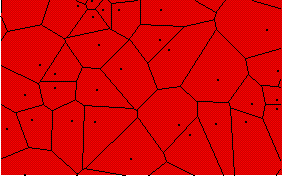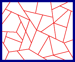 The Voronoi tessellation constructed from particles which form a Poisson process. Each polygon contains one particle and comprises the region of the plane closer to that particle than to any other. There are no edge effects in this picture, as the figure was constructed initially on a much larger domain. |