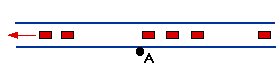 The blue dots on this axis are the times at which the front axle of vehicles cross a line drawn across the road. The temporal spacing between vehicles is called a "headway" and this comprises a "following spacing" plus (if the vehicle is not following its predecessor) a "gap". The flow rate of the traffic per unit time is
