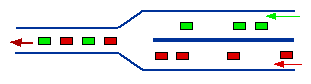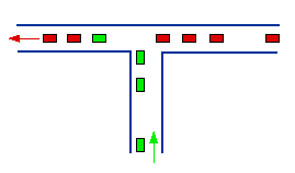n traffic streams merge (here n=2) with no stream having priority over any other. The only constraint is that the cars must wait at the merge point until there is the required one time-unit spacing between themselves and the car in front.